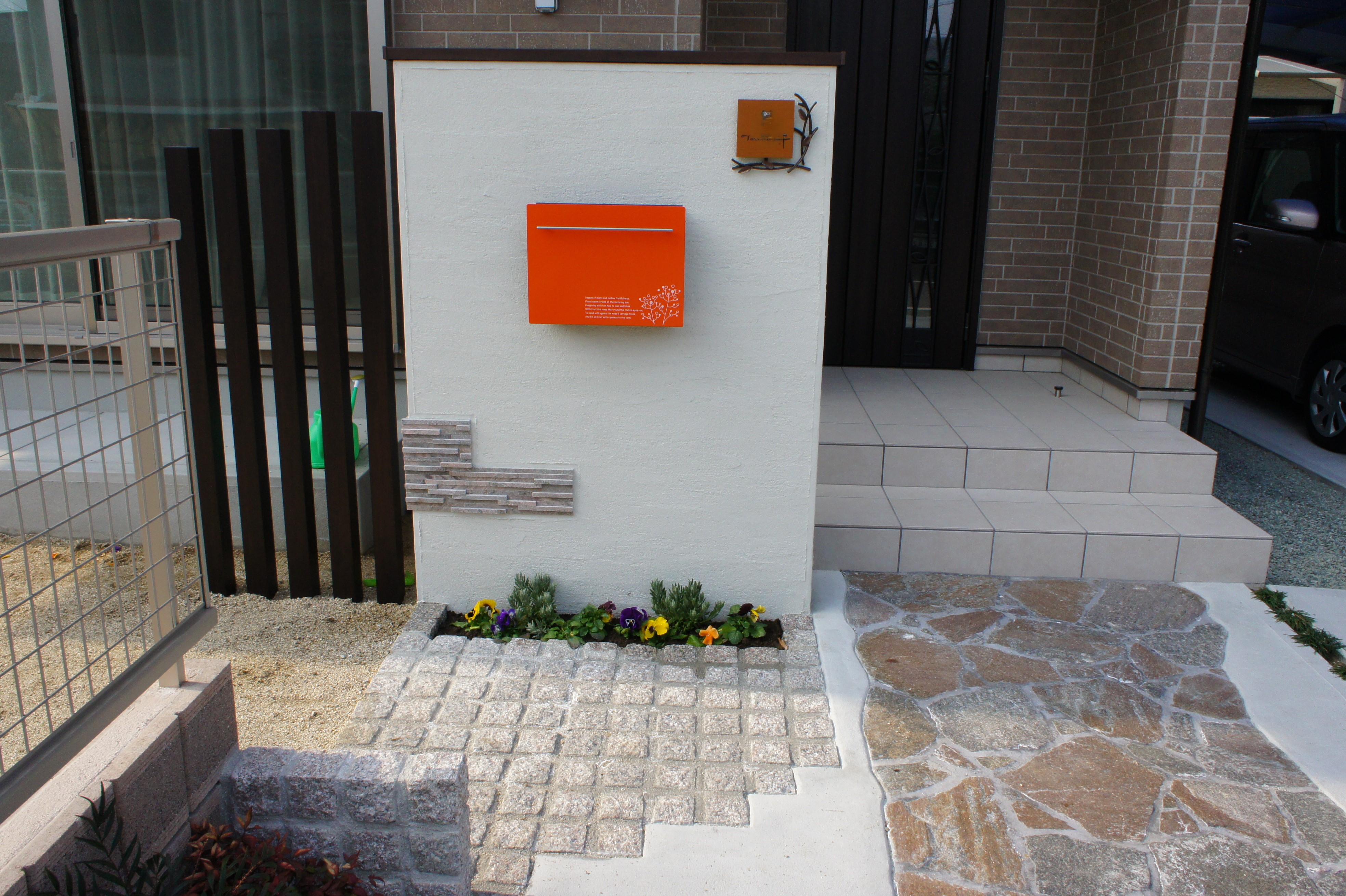 最後に綺麗なオレンジ色のポストと表札を取り付けて完成です。