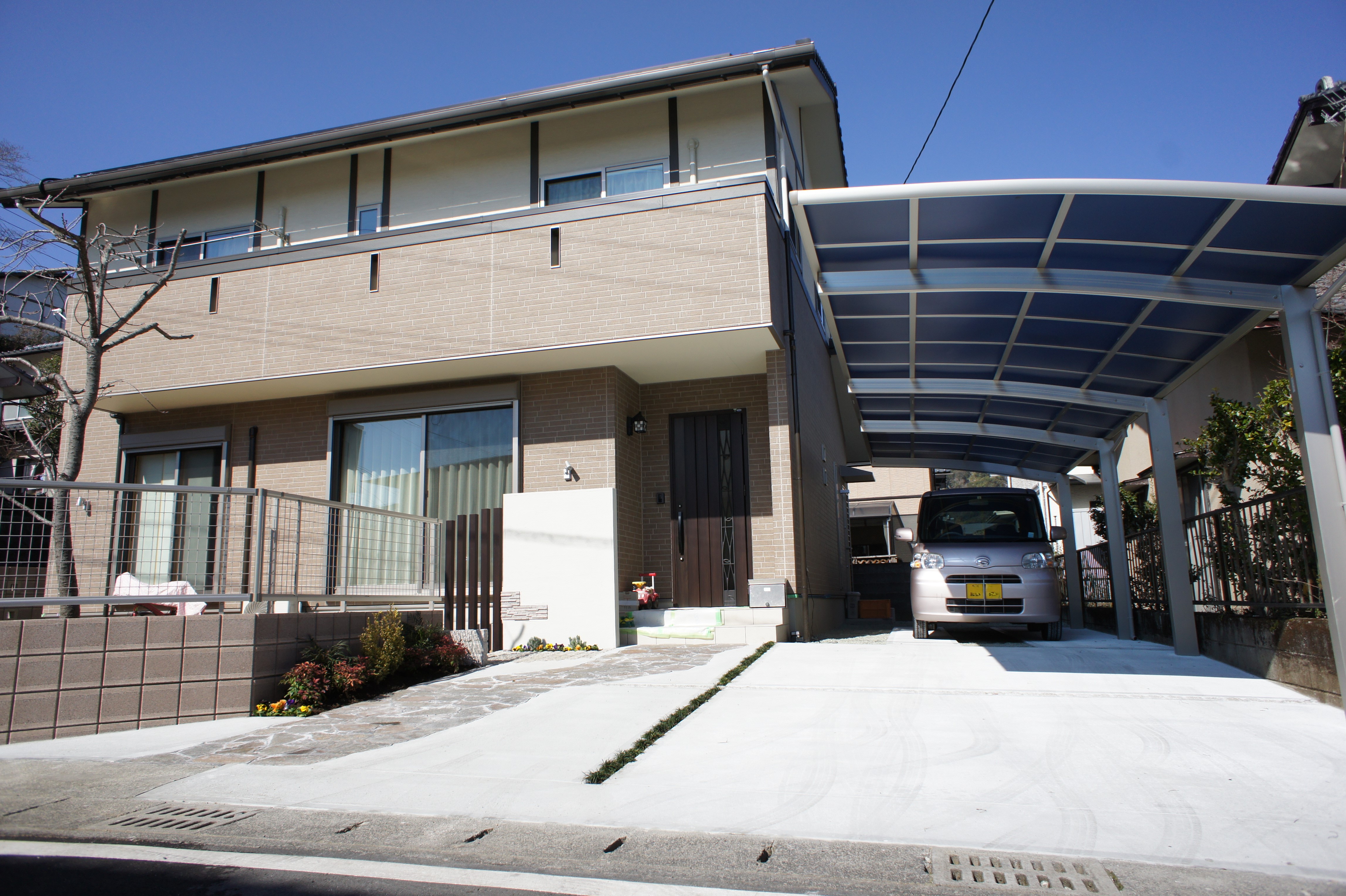 カーポートは、YKKAPのアリュース2台用(奥行2連結)を設置しました。