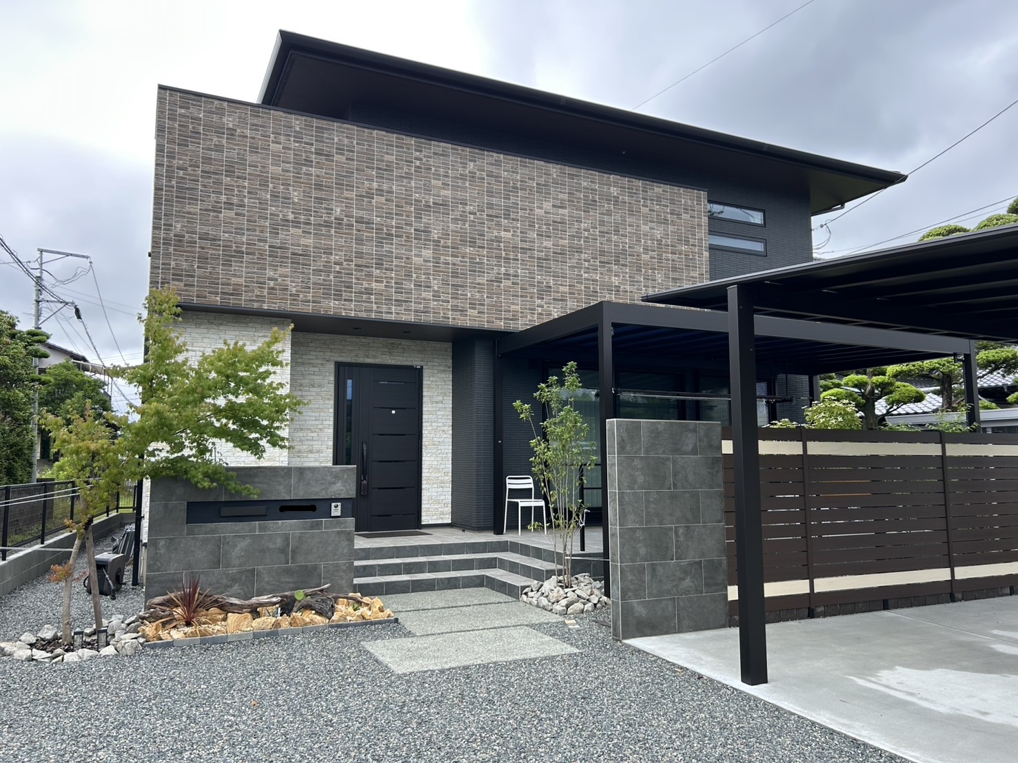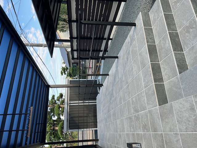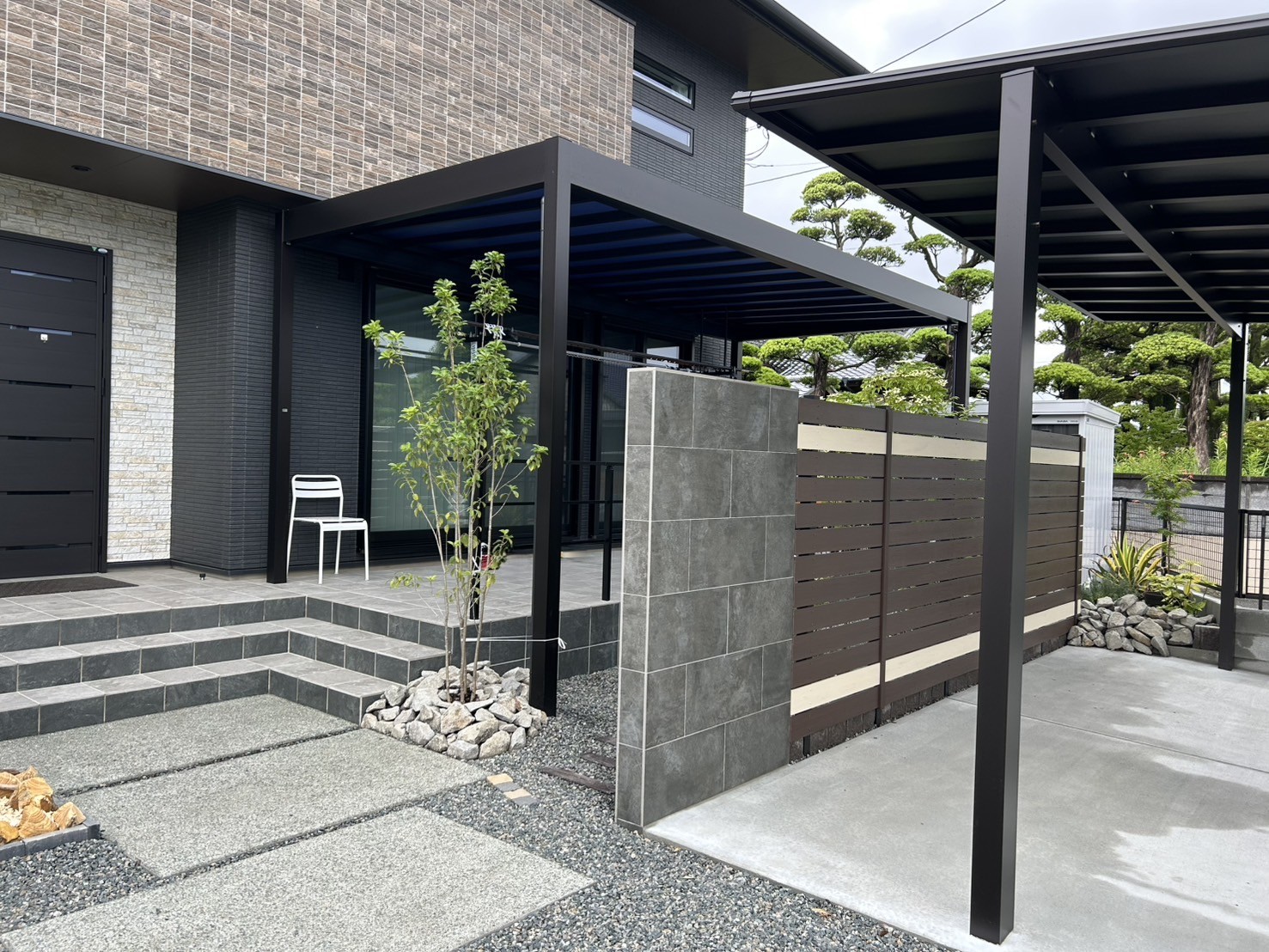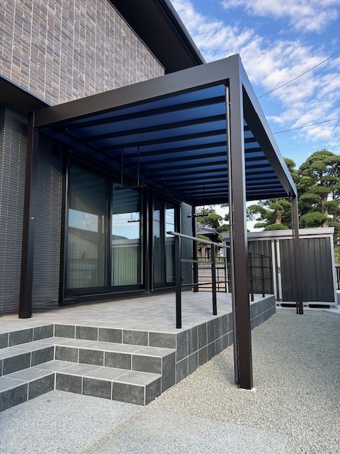リビング前には今回YKKAPのリレーリアルーフ独立式を施工しました。日差しをしっかり遮ることができるのと存在感のあるフレームが特徴です。