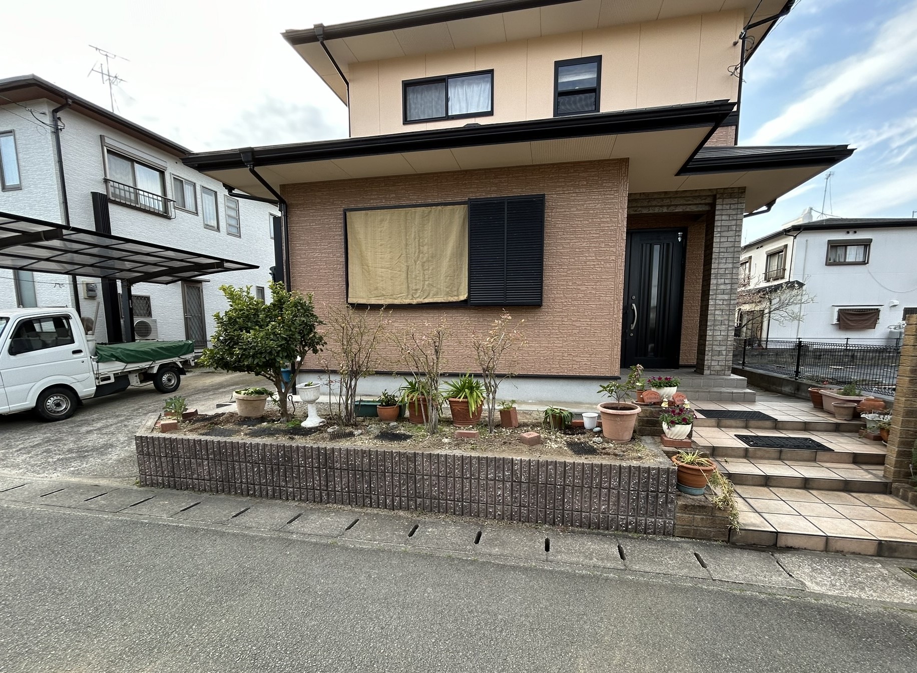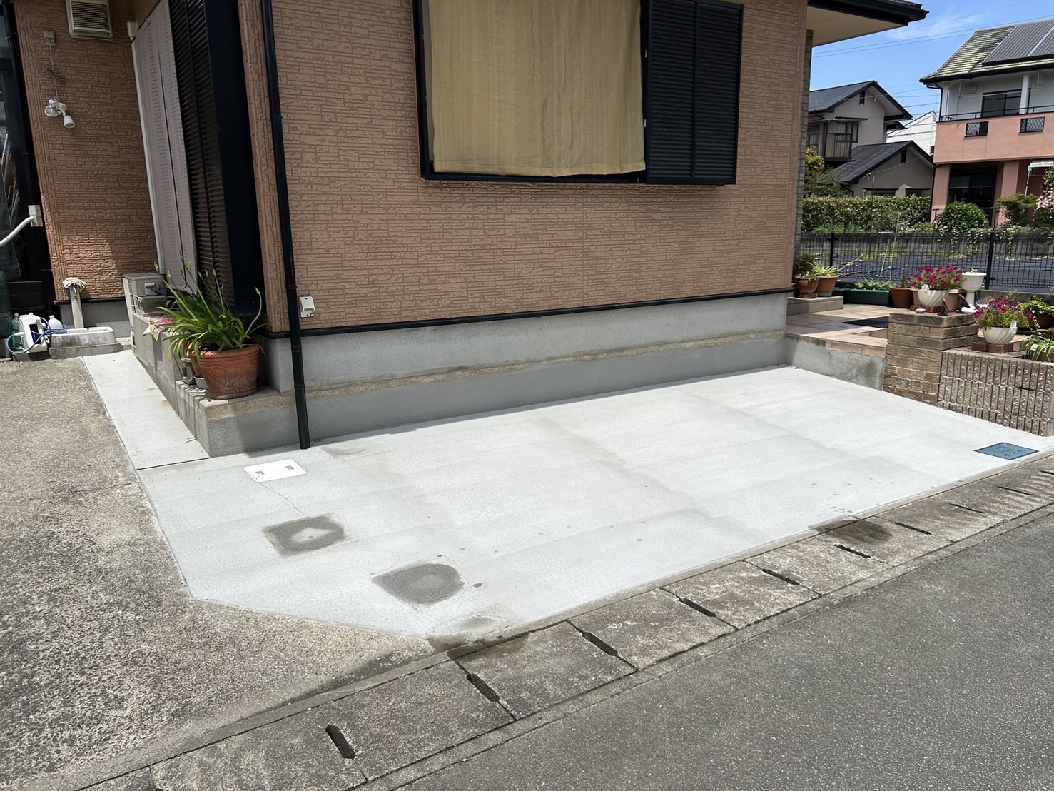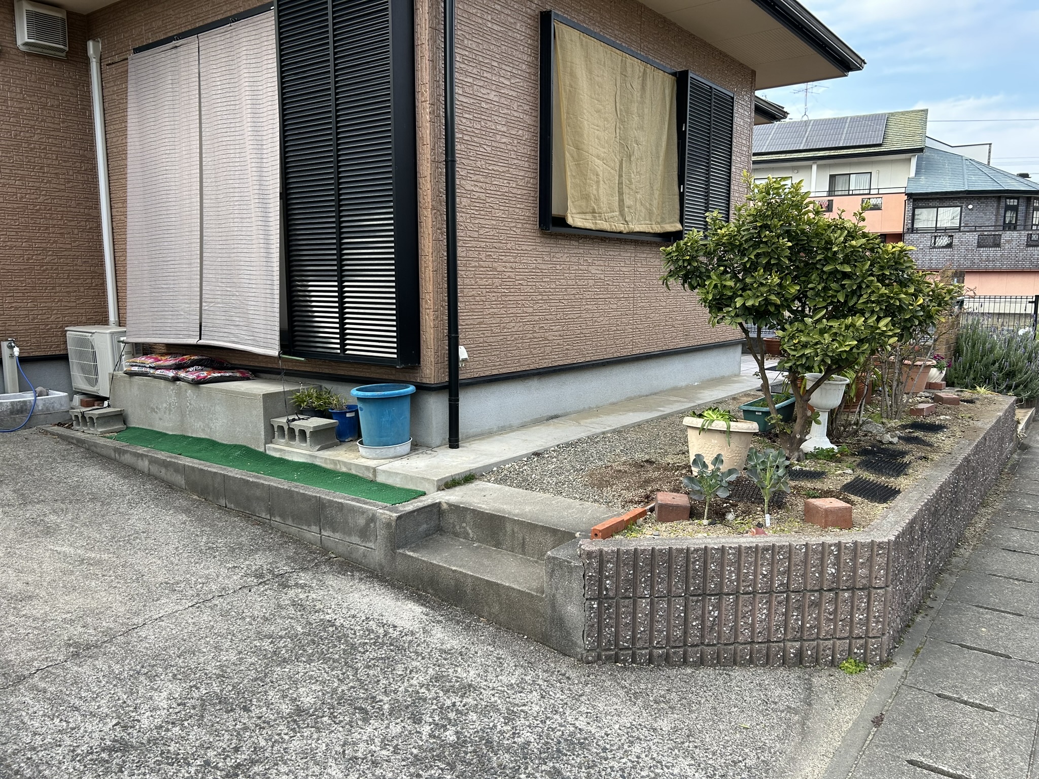 花壇を撤去して駐車スペースを広げました。元々あった駐車場とつながり、広さもあるので車が停めやすくなりました。 量水器も車があまり踏まないところに移動しました。 時間とともに変化する家族のカタチに合わせて駐車場をリフォームしました。