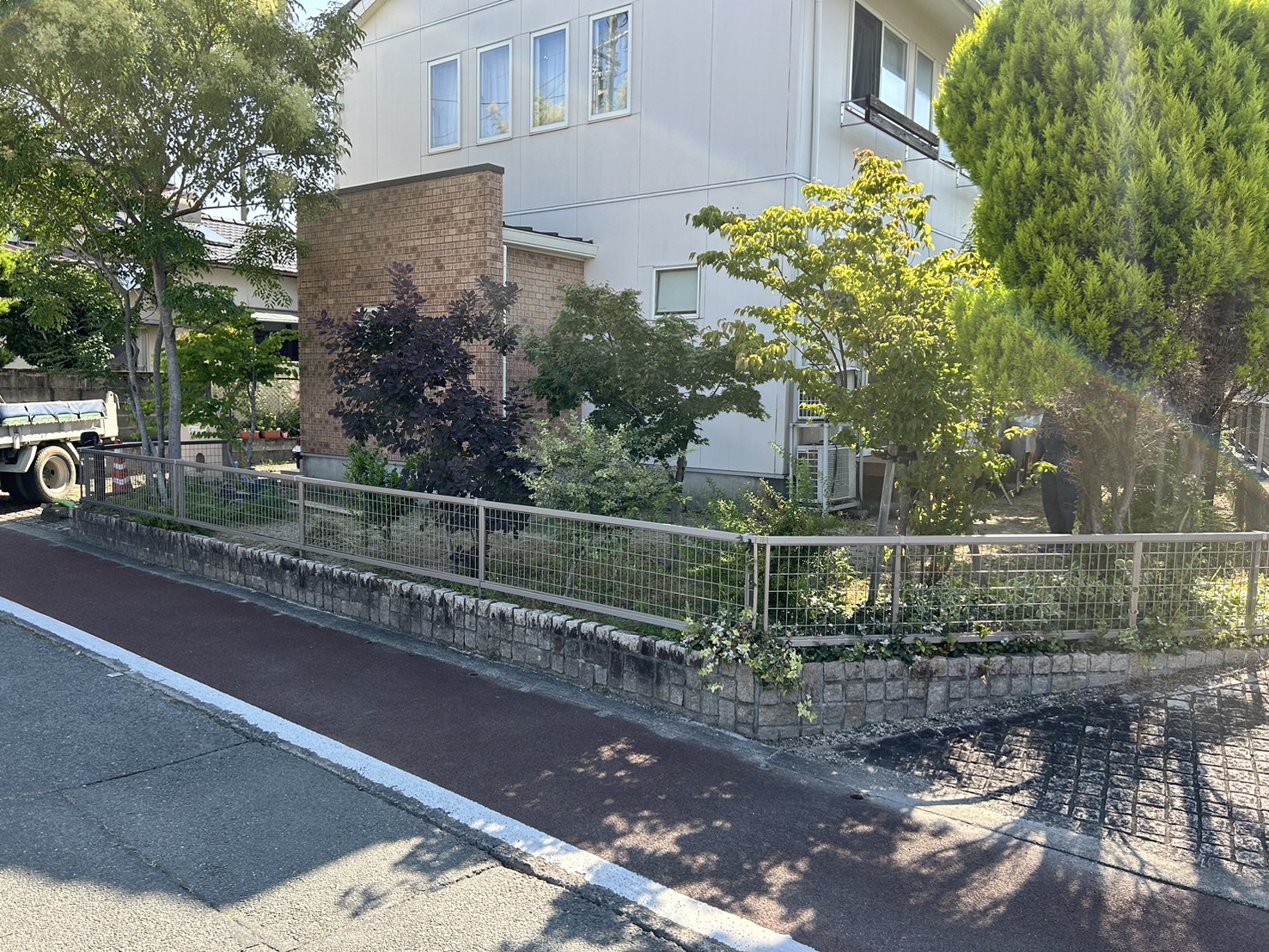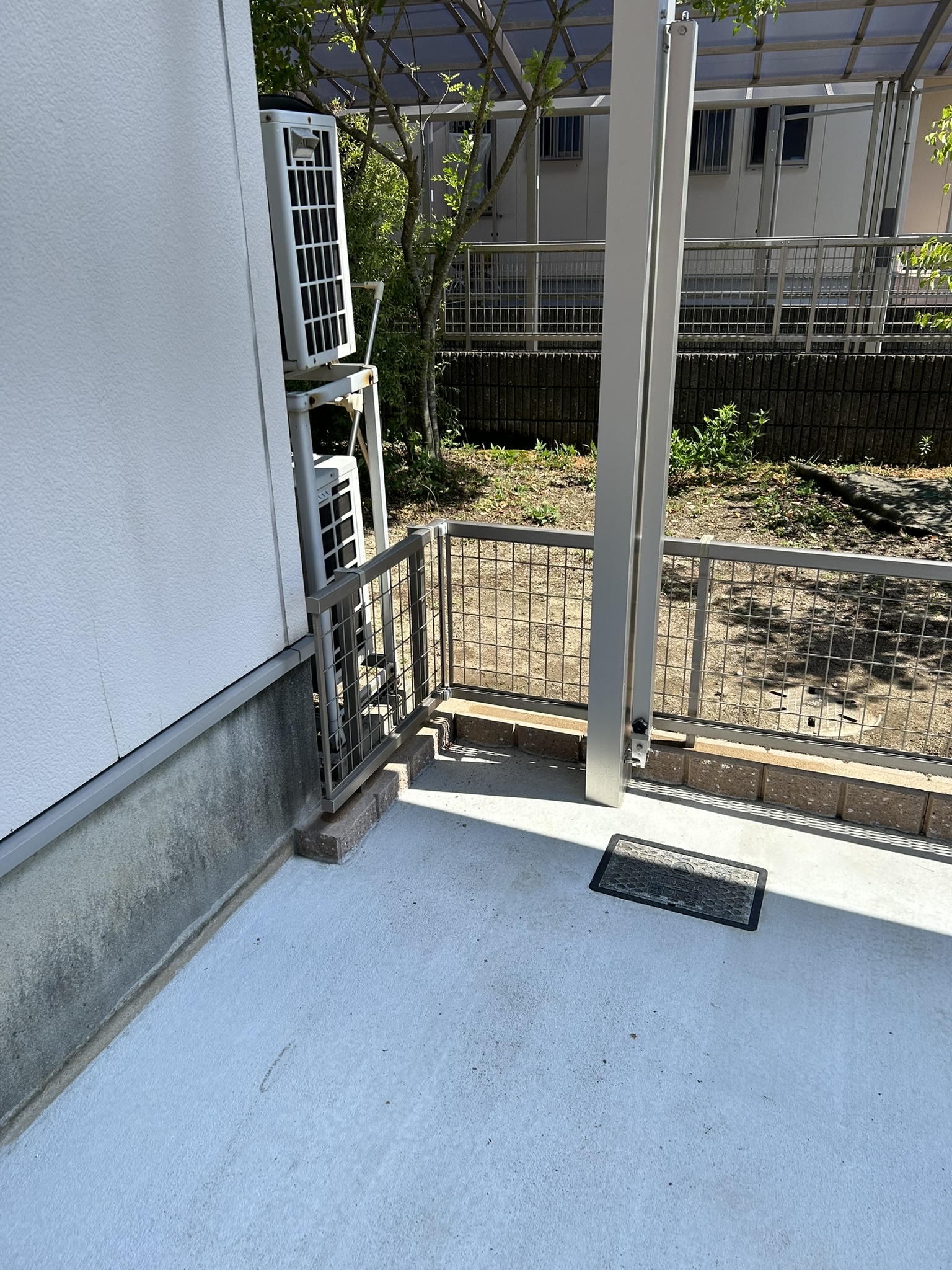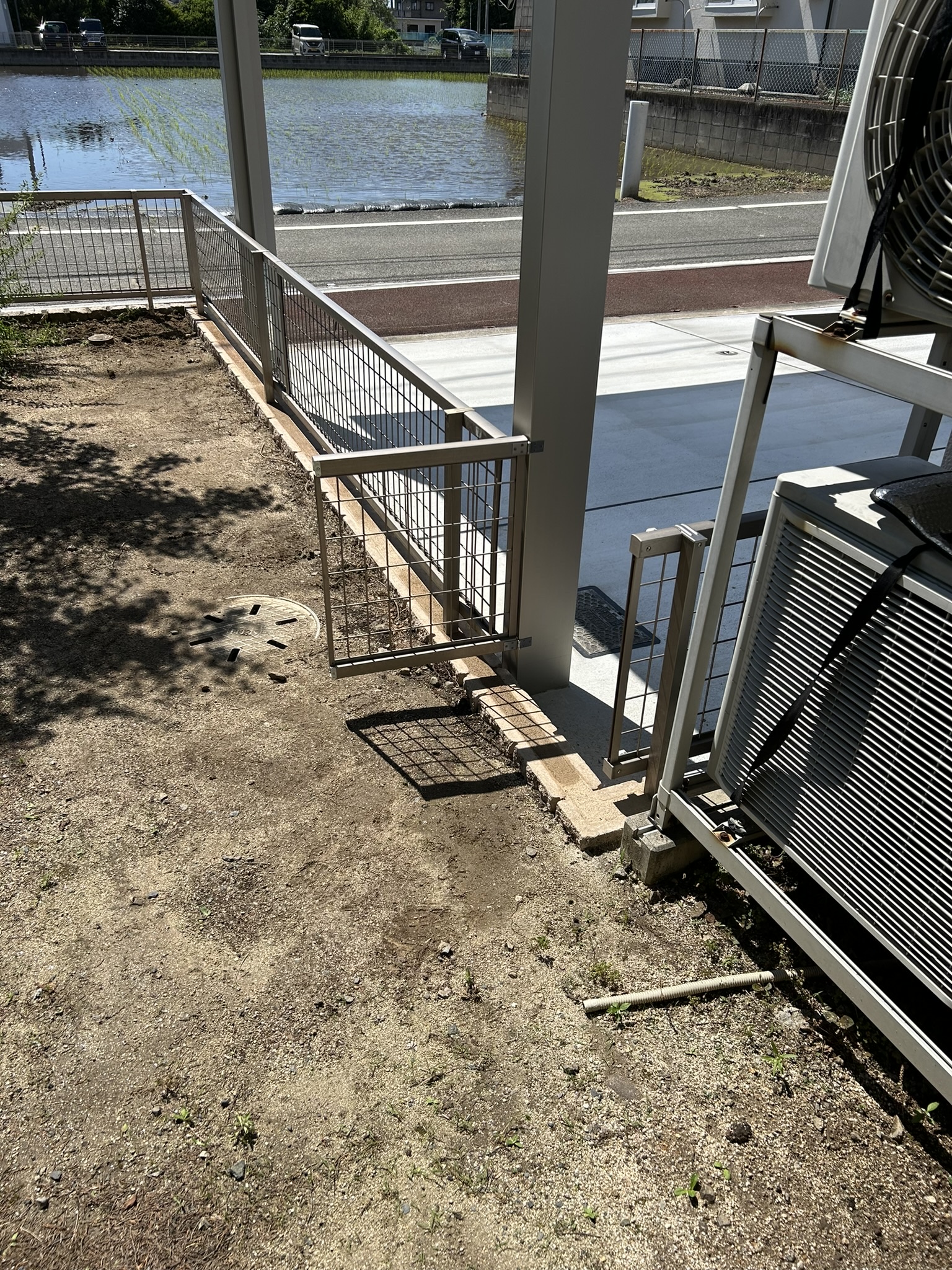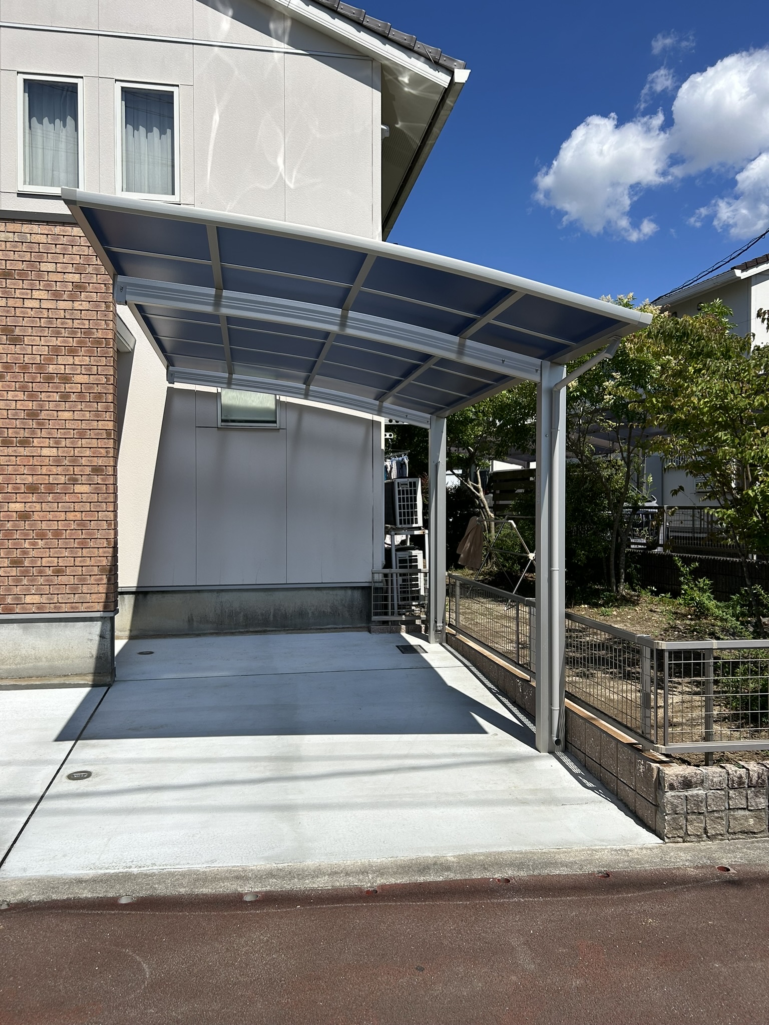 広かったお庭を少し削って車とバイクと自転車を停めるためのスペースを作りました。 カーポートも取付け日差し除けもでき雨の日も安心して乗り降りできるようになりました。 既存のフェンスは再利用してお庭をしっかりと囲むことでワンちゃんがお庭を自由に走れるようにし、1ヶ所に簡易的な入口をつくったことで、お庭と駐車場も行き来できるので外回りの動線もよくなりました。