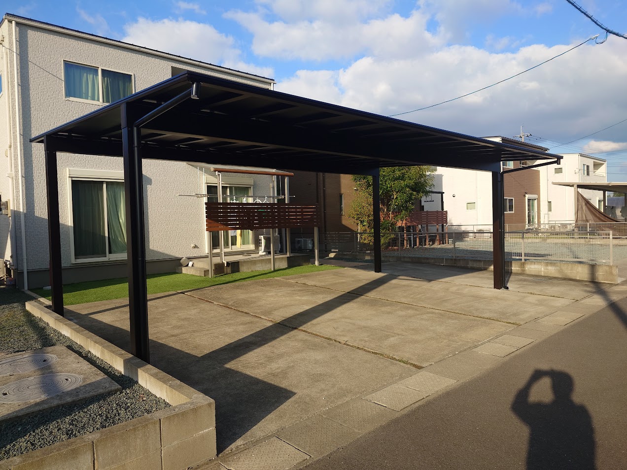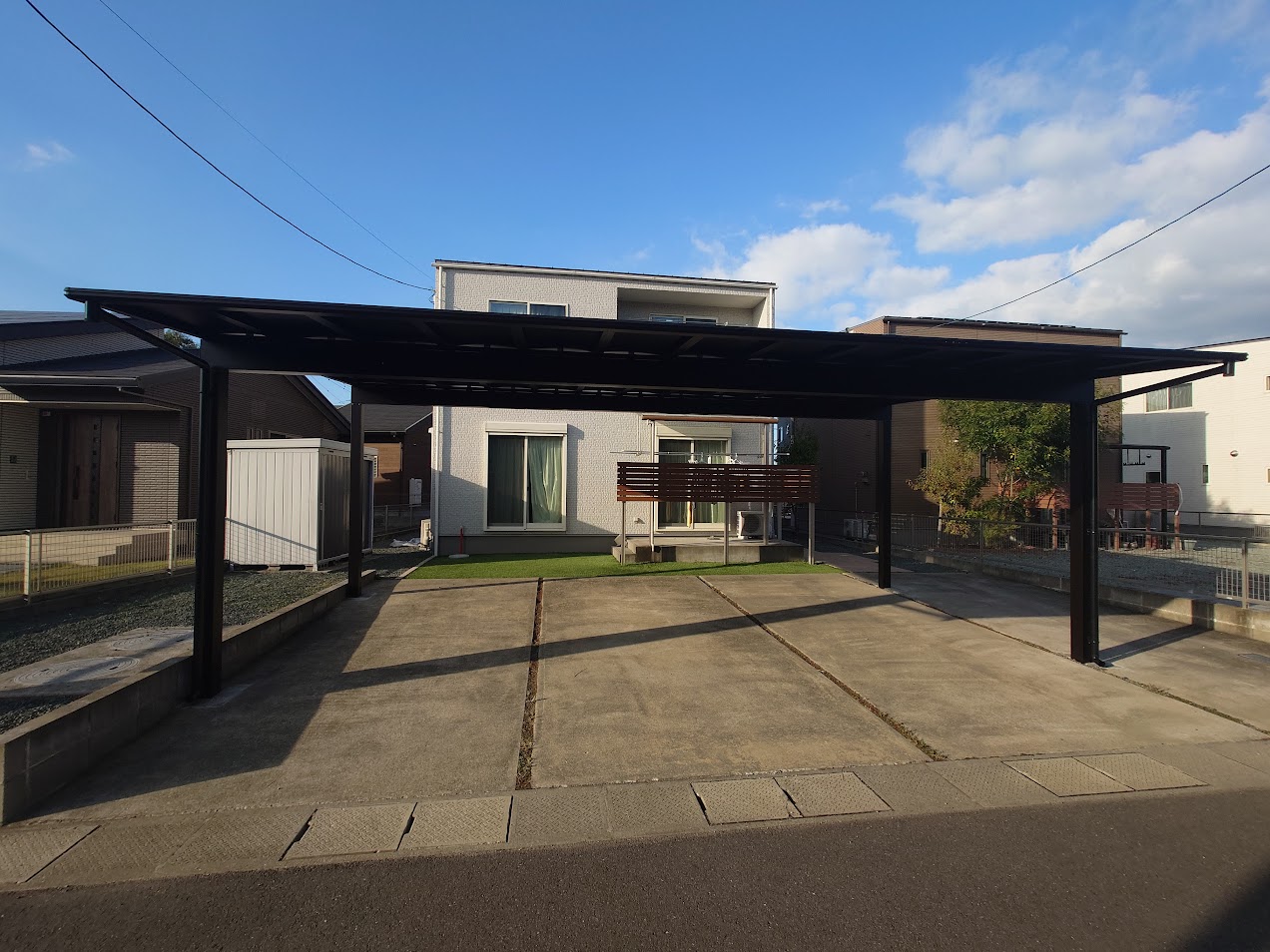 YKKAPのフラット屋根カーポート・エフルージュ3台用を施工しました。 今回の屋根材は、昨年新たに発売されたモダンでスタイリッシュなブラックマット色です。 落ち着いた雰囲気にもなり、夏の暑い日差しでもカーポートの下が暑くなりにくいです。