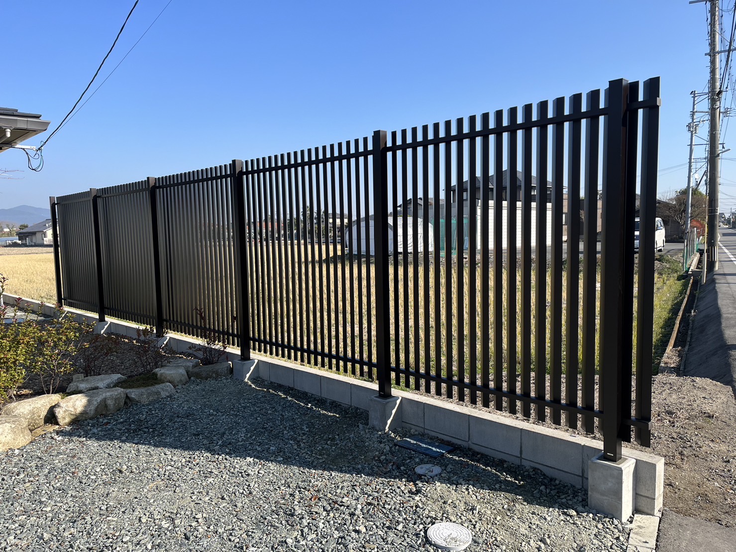 道路からの視線を遮る三協アルミの縦格子目隠しフェンス、エルファード5型を設置しました。 格子が斜めのルーバーになっていて片側からしっかり目隠しとなり、反対側は外の様子も見え風通しも良くなっています。