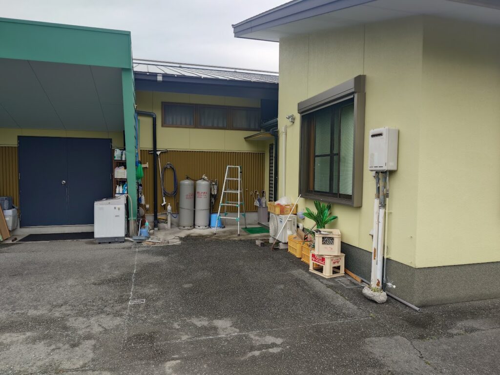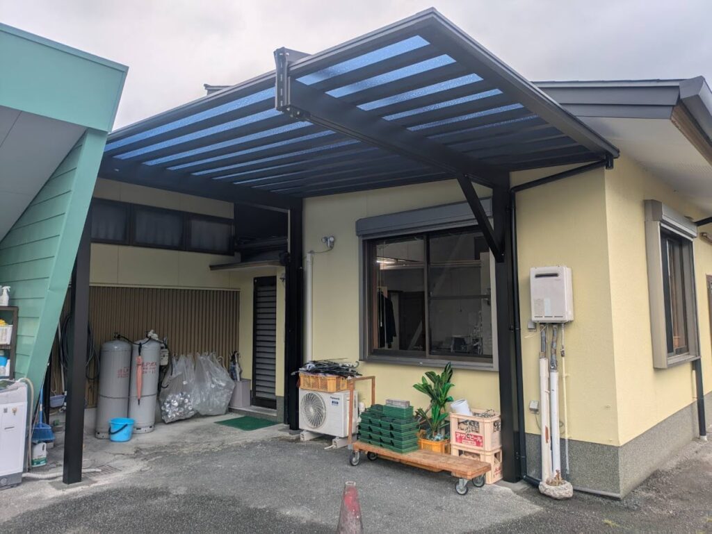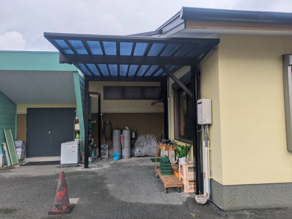 建物と建物の間に強度がある1500タイプの1台用(4本柱)のカーポートを設置しました。向かって右側の建物際の柱は室外機や窓があるため限られたところにしか建てることができませんでした。